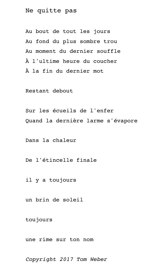 Ce poème, le premier de la nouvelle série mots contre maux, est dédié à Paul Éluard et Jacques Brel, deux poètes qui m’encouragent chaque jour à écrire au nom de l’espérance et du sentiment.