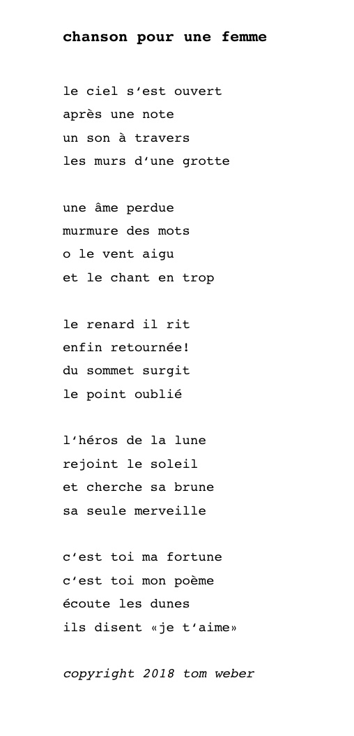 mots contre maux #09 Tom Weber poèmes français 8. Jul 2018 1 Minute Une chanson, jetée dans le vent, par un souvent perdu, à qui le mot «fin» est inconnu Share this: Click to share on X (Opens in new window) X Click to share on Facebook (Opens in new window) Facebook Like Loading... Published by Tom Weber I was born in 1996 in Luxembourg. My interests include writing and reading books, Buddhist philosophy and practice, Chinese Gong Fu style tea and languages. View all posts by Tom Weber Published 8. Jul 2018