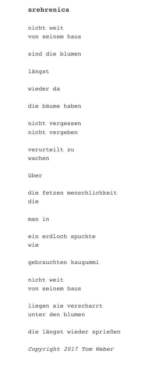 hinter dem reim #02 (200. Artikel) This is the German translation of my poem „srebrenica”. To read the original in Croatian/Serbian click here (for Roman alphabet) or here (for Serbian Cyrillic script). You can also read a translation in English or French. Share this: Click to share on X (Opens in new window) X Click to share on Facebook (Opens in new window) Facebook Like Loading...